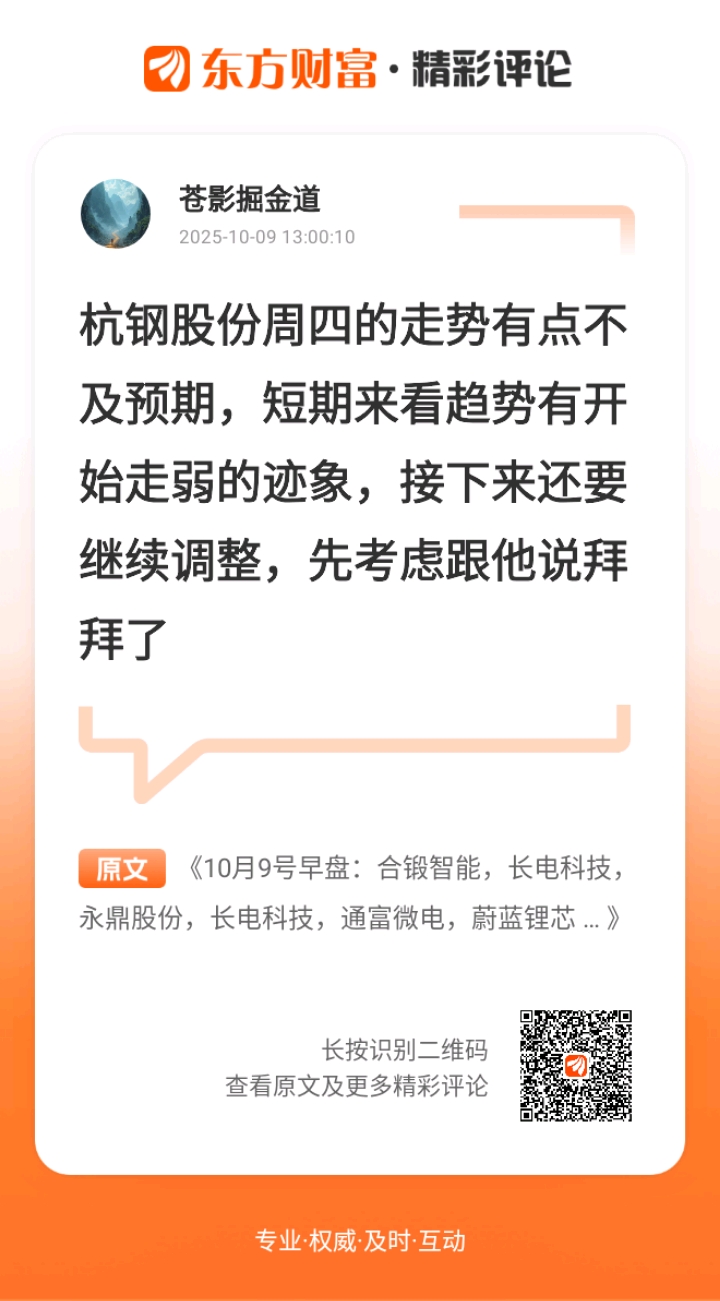 了解 //@苍影掘金道 :杭钢股份周四的走势有点不及预期,短期来看趋势有开始走弱的迹象,接下来还要继续调整,先考虑跟他说拜拜了 $江西铜业(SH600362)$$深科技(SZ000021)$$特变电工(SH600089)$
