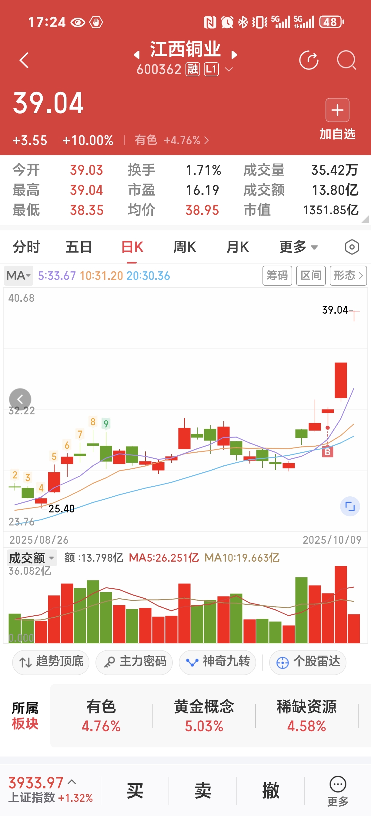 $江西铜业(SH600362)$ 去弱留强,卖掉北方铜业,留着江西铜业,只留龙头板块的龙头股,今天铜板块最强,大家没意见吧!