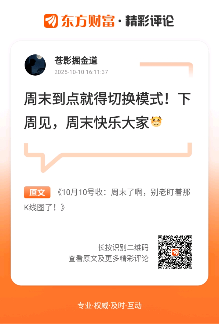 周末了啊,别老盯着那K线图了!有肉的赶紧带着老婆孩子、爸妈出去搓一顿,火锅烧烤随便造,一家人热热闹闹的多好。没肉的也别耷拉个脸,这股市本来就起起落落,人生不就是多遇点坎儿才有意思嘛!先好好陪家人吃顿热饭。下周见!我也去陪陪我的家人了。周末愉快战友们!