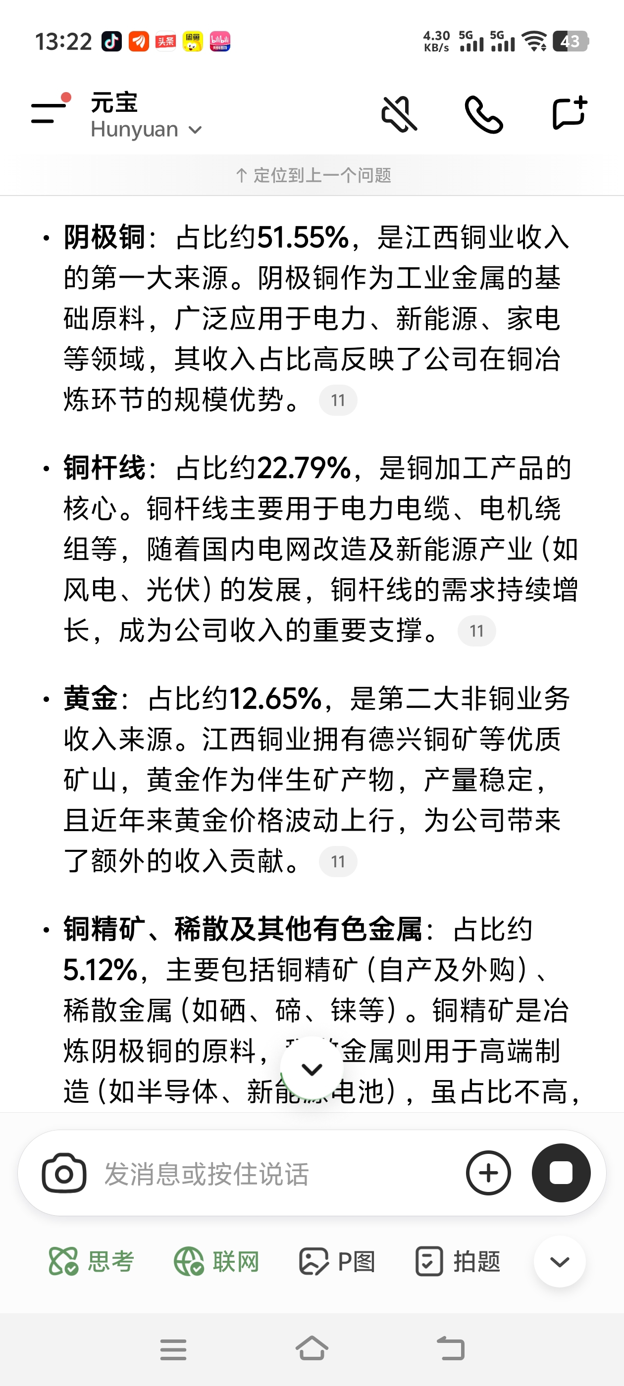 $江西铜业(SH600362)$ 和大家解释一下什么叫铜精矿长期协议,企业为了避免现货价格波动通常铜原料的进货价早在一年前就订好了固定进货价,所以不会受平常期货波动影响,第二,江西铜业主要做的是把铜原料加工成阴极铜拿去卖的生意,阴极铜占51.5%,铜杆占22.79%,黄金占12.65%,昨晚暴跌的铜期货的铜精矿只占5%