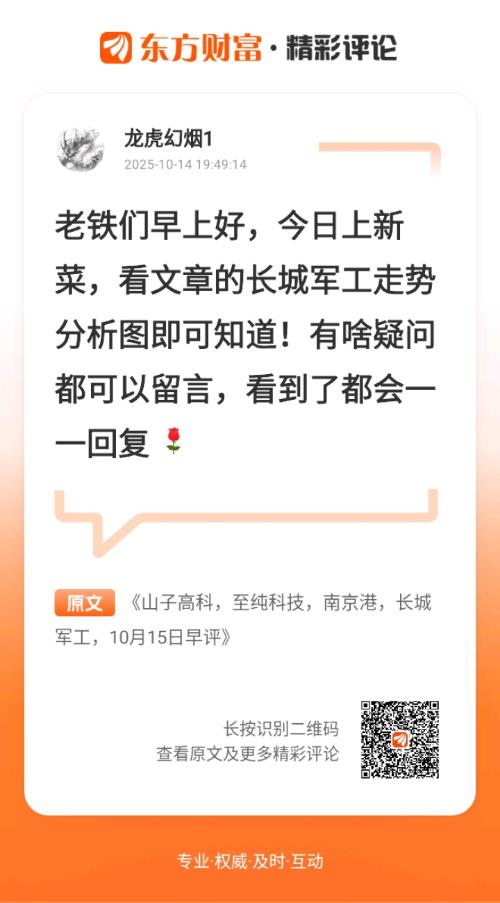 老师牛皮又有耐心一个个解答粉丝疑问 //@龙虎幻烟1 :老铁们早上好,今日上新菜,看文章的长城军工走势分析图即可知道!有啥疑问都可以留言,看到了都会一一回复 $江西铜业(SH600362)$$澄星股份(SH600078)$$白银有色(SH601212)$