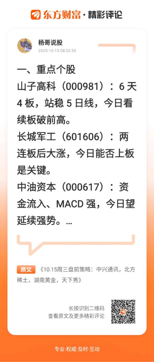 $江西铜业(SH600362)$$湖南黄金(SZ002155)$$中兴通讯(SZ000063)$//@杨哥说股 :一、重点个股山子高科(000981):6 天 4 板,站稳 5 日线,今日看续板破前高。长城军工(601606):两连板后大涨,今日能否上板是关键。中油资本(000617):资金流入、MACD 强,今日望延续强势。二、指数与盘面指数:昨日高开洗盘,放量 2200 亿,今日预计震荡向上。盘面:情绪降温,资金偏好业绩确定板块(如培育钻石、煤炭),今日主基调谨慎。三、持仓计划(均 “继续格局”)天下秀、赛力斯:企稳 10 日线,待情绪修复反弹。江西铜业、中兴通讯:看 5 日线支撑,大势回暖望转强。北方稀土:供需紧平衡,今日或整理后上行。湖南黄金:贵金属支撑,大概率红盘震荡或冲高。