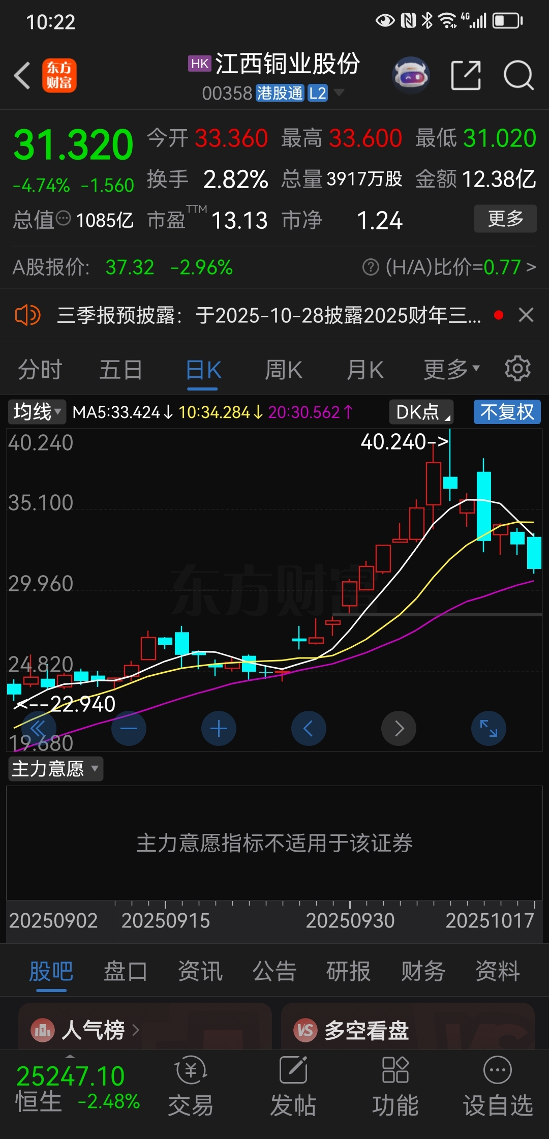 $江西铜业(SH600362)$ 江铜港股从40跌到31,江铜A股也会从42跌到33