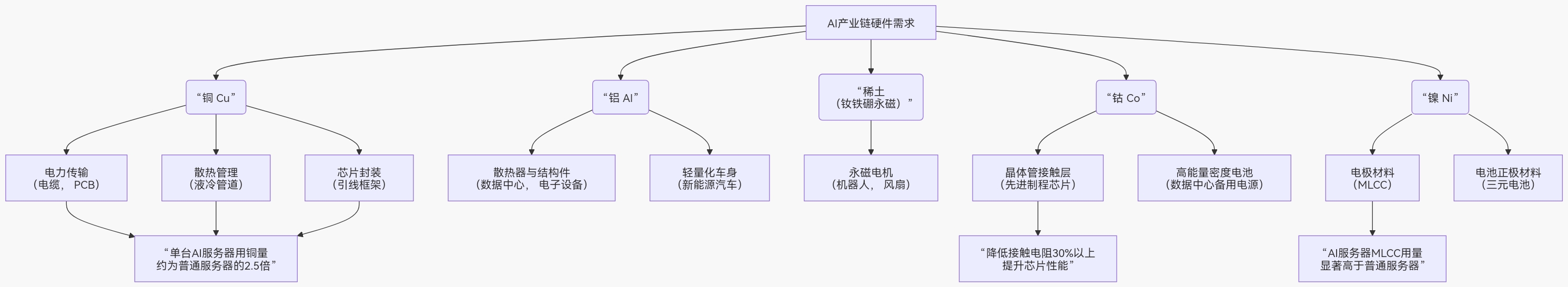 AI产业的蓬勃发展,从服务器、数据中心到新能源汽车等,都离不开有色金属作为关键基础材料。下图梳理了主要金属在AI产业链中的应用与需求增长点。