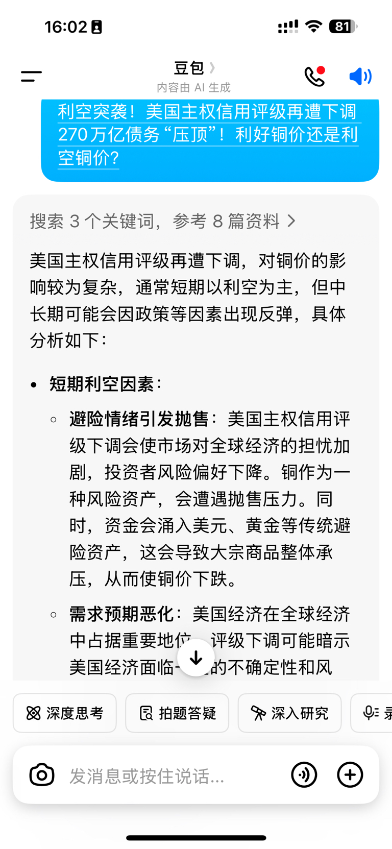 $江西铜业(SH600362)$ 美国评级下调,经济不好,用铜少了!利空铜价