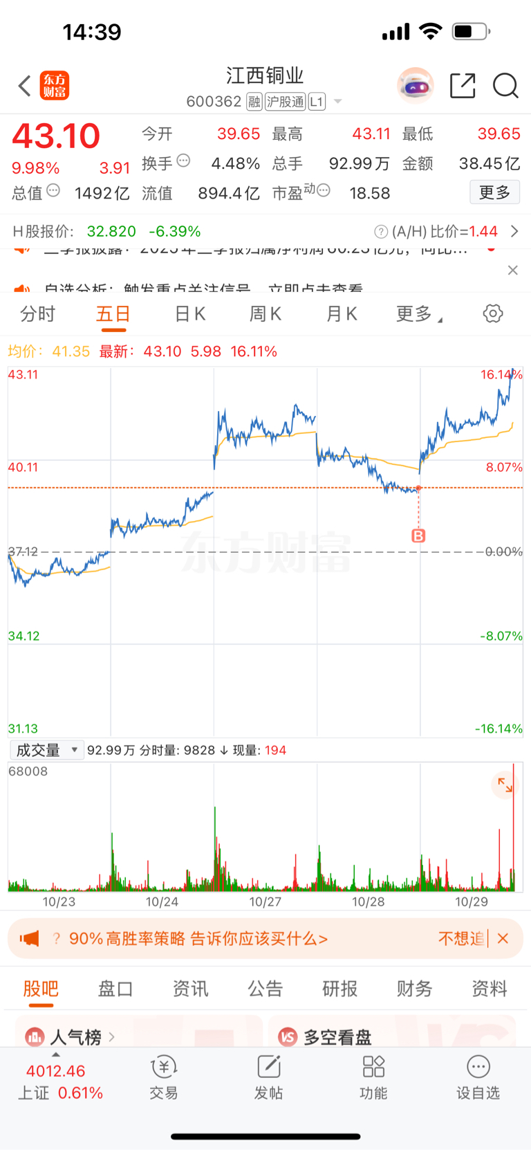 $江西铜业(SH600362)$ 昨天尾盘买,今天涨停,嘿嘿嘿
