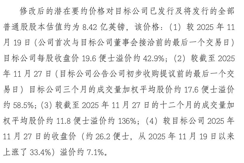 该价格较2025年11月19日(公司首次与目标公司董事会接洽前的最后一个交易日)目标公司每股收盘价19.6便士溢价约42.9%;较截至2025年11月27日(目标公司公告公司初步收购提议前的最后一个交易日)目标公司三个月的成交量加权平均股价约17.6便士溢价约58.5%。