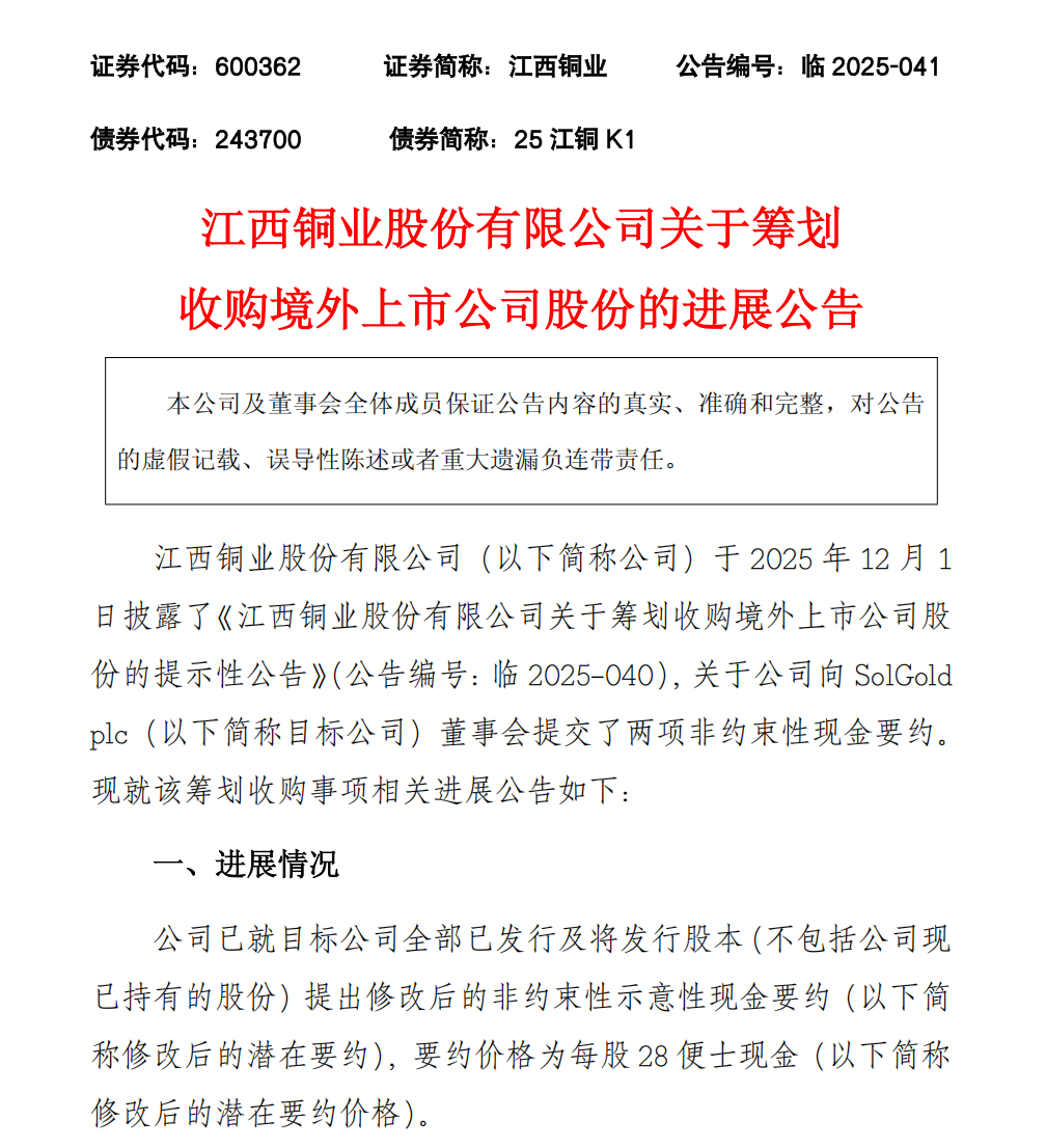回溯来看,11月30日晚,江西铜业公告称,公司分别于英国伦敦时间2025年11月23日及11月28日向伦敦证券交易所上市公司索尔黄金董事会提交了两项非约束性现金要约。江西铜业拟以每股26便士的价格收购目标公司全部股份,但两项非约束性现金要约均已被目标公司董事会拒绝。