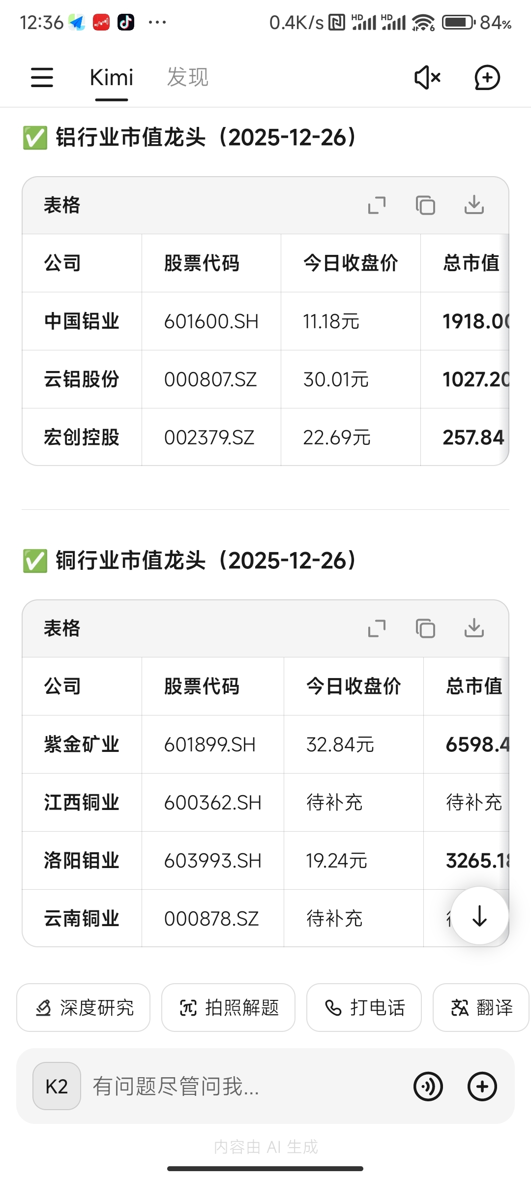 $江西铜业(SH600362)$ 针对10点左右突发消息,针对氧化铝和铜冶炼的骨干企业大力推动产业升级改造。我午间统计了下铜和铝的上市的规模企业(按市值大小统计)中国铝业,云铝股份,宏创控股,紫金矿业,江西铜业,洛阳钼业,云南铜业。诸位下午开盘捕捉涨停的精准标的企业。我介入的中国铝业。