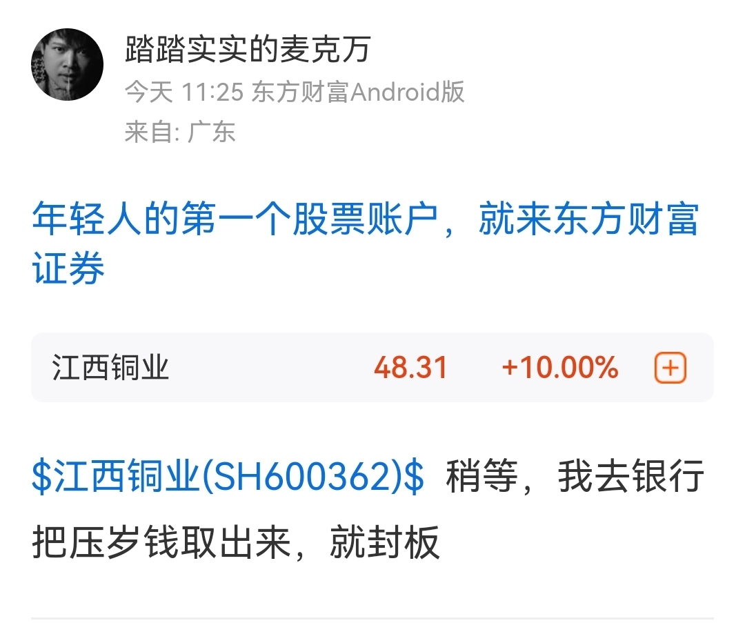 郑重声明:用户在财富号/股吧/博客等社区发表的所有信息(包括但不限于文字、视频、音频、数据及图表)仅代表个人观点,与本网站立场无关,不对您构成任何投资建议,据此操作风险自担。请勿相信代客理财、免费荐股和炒股培训等宣传内容,远离非法证券活动。请勿添加发言用户的手机号码、公众号、微博、微信及QQ等信息,谨防上当受骗!