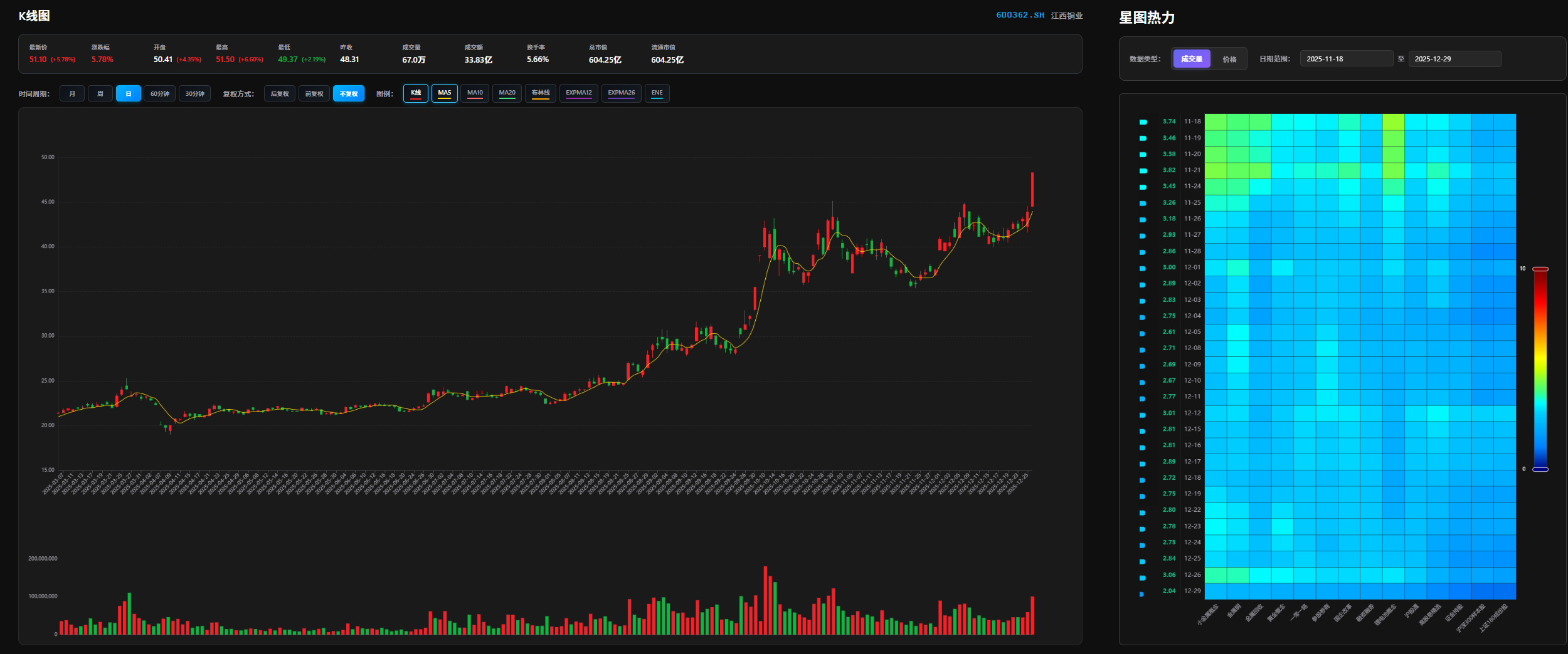 1. 早盘大盘热度创近一个月新低,热力图左边数值显示大盘热度只有1.98。2.第二张个股热力图颜色显示江西铜业个股热度略微回落,注意风险。