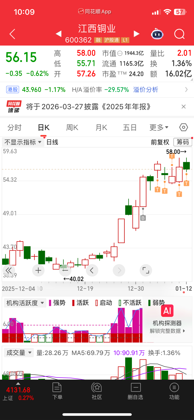 今天江铜涨停62元,大家留言者随机抽一住送一台配置迪迪车