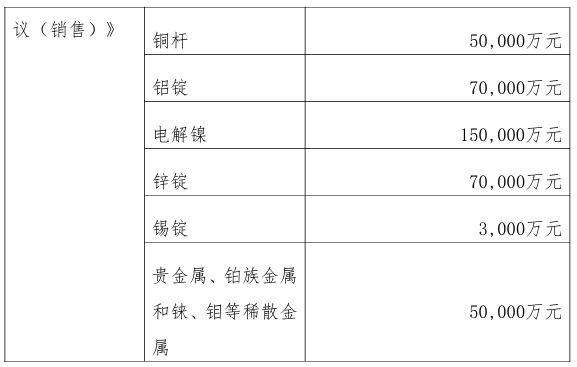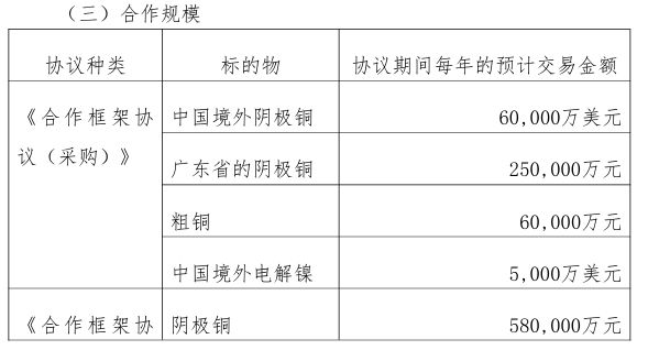 具体交易内容包括:采购方面,中国境外阴极铜预计年交易金额为6亿美元,广东省阴极铜为25亿元人民币,粗铜为6亿元人民币,中国境外电解镍为5000万美元;销售方面,阴极铜预计年交易额为58亿元人民币,铜杆5亿元人民币、铝锭7亿元人民币、电解镍15亿元人民币、锌锭7亿元人民币、锡锭3000万元人民币,以及贵金属和稀散金属5亿元。