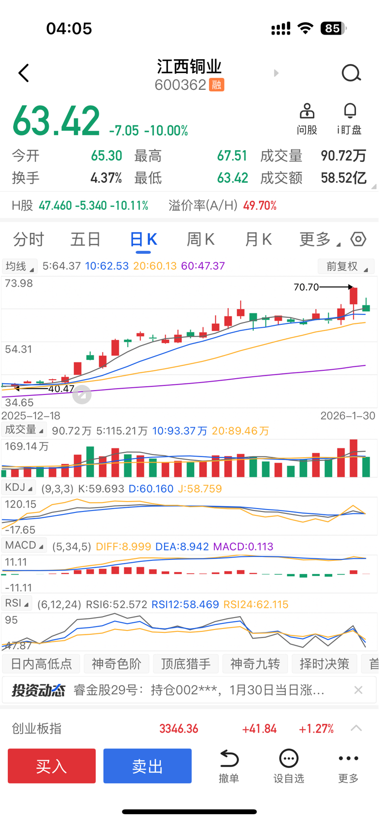 $江西铜业(SH600362)$ 最高位70.70顶子对已通知见顶撤离,且没封板,没有坏透,给了逃生口