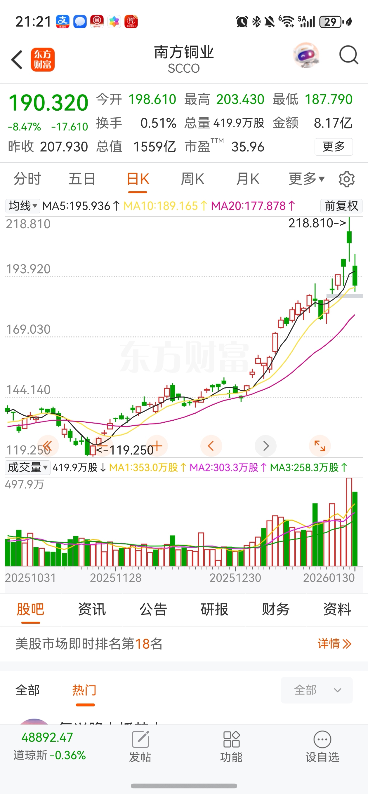 $江西铜业(SH600362)$ 江铜的标的股,南方铜业昨晚又大跌,所以周一继续跌停吗
