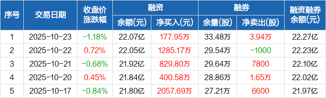 融资方面,当日融资买入5821.33万元,融资偿还5643.38万元,融资净买入177.95万元,连续6日净买入累计5028.42万元。融券方面,融券卖出4.03万股,融券偿还900股,融券余量33.48万股,融券余额2048.98万元。融资融券余额合计22.27亿元。