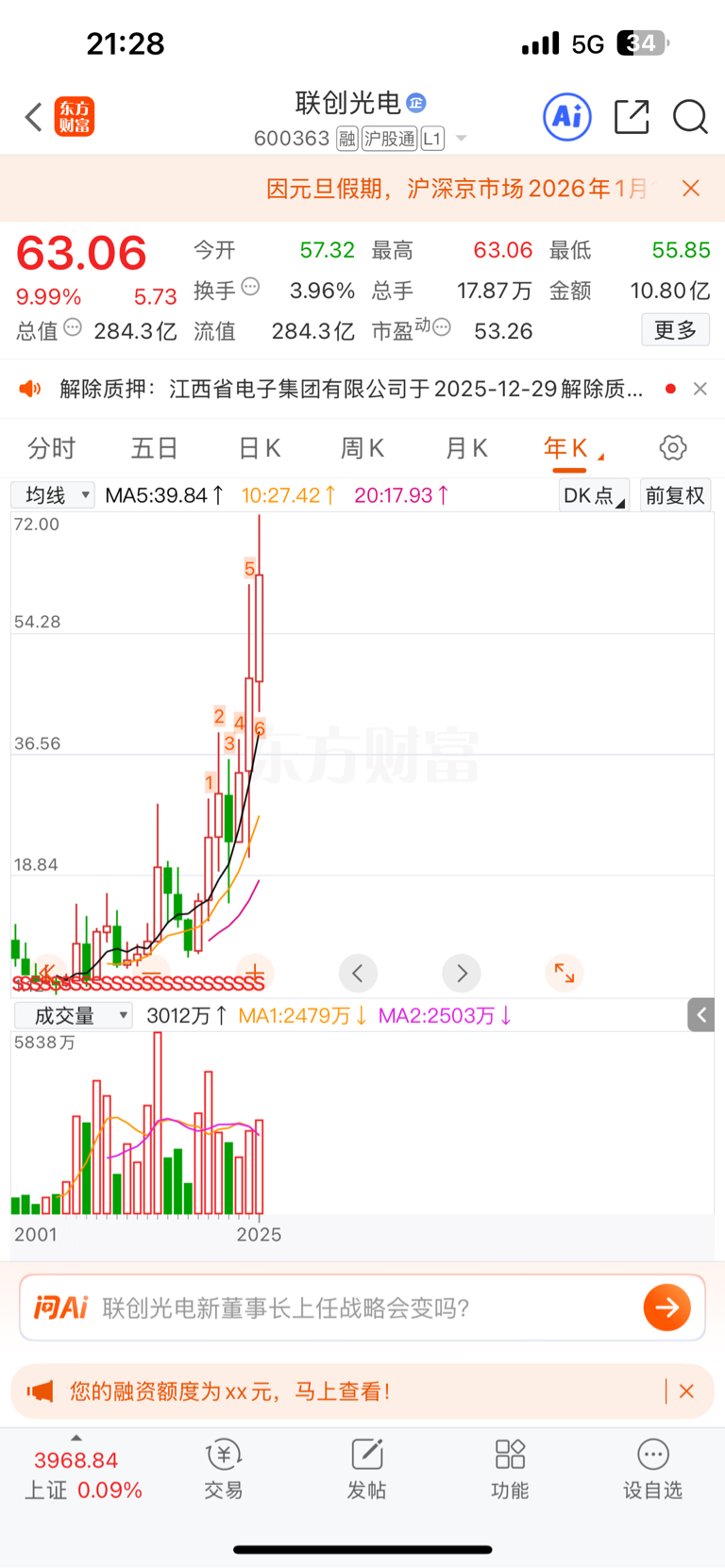 $联创光电(SH600363)$ 这三年多的年线,真的一年一台阶,就算明年会跌,估计55元以下都买不到