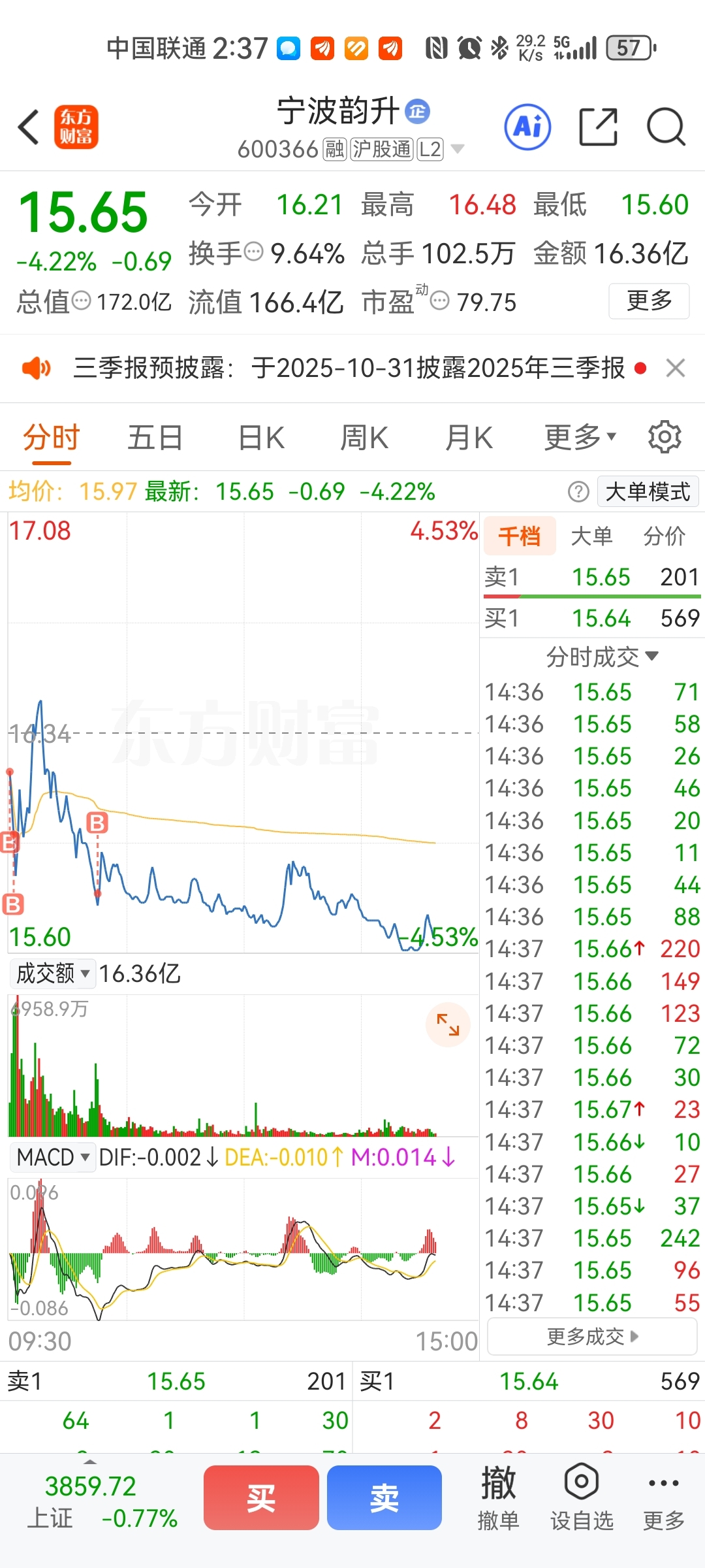 $宁波韵升(SH600366)$ 早晨怕进来晚了,