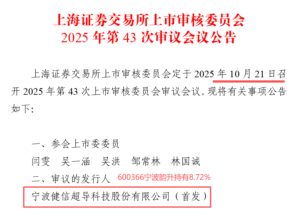 与宁波健信超导相关的个股是宁波韵升(600366)。