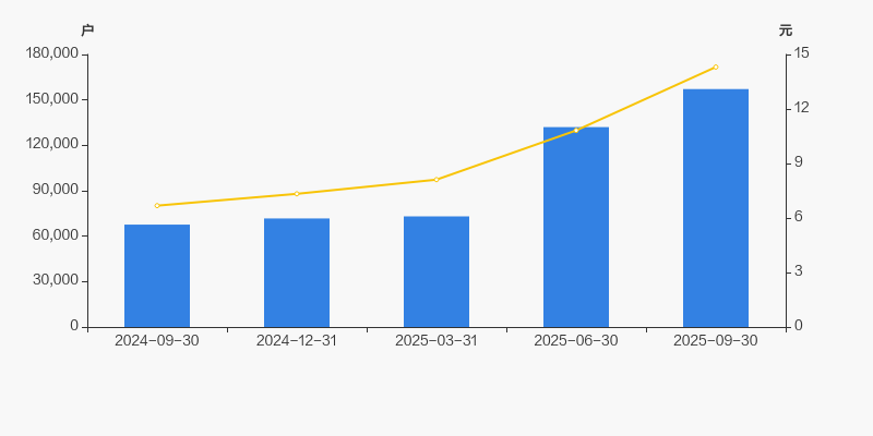 自2024年9月30日以来,公司股东户数连续4期上涨,截至目前增幅为132.37%。2024年9月30日至2025年9月30日区间股价上涨114.14%。