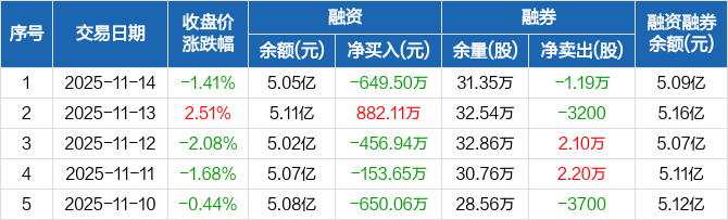 宁波韵升:融资净偿还649.5万元,融资余额5.05亿元(11-14)