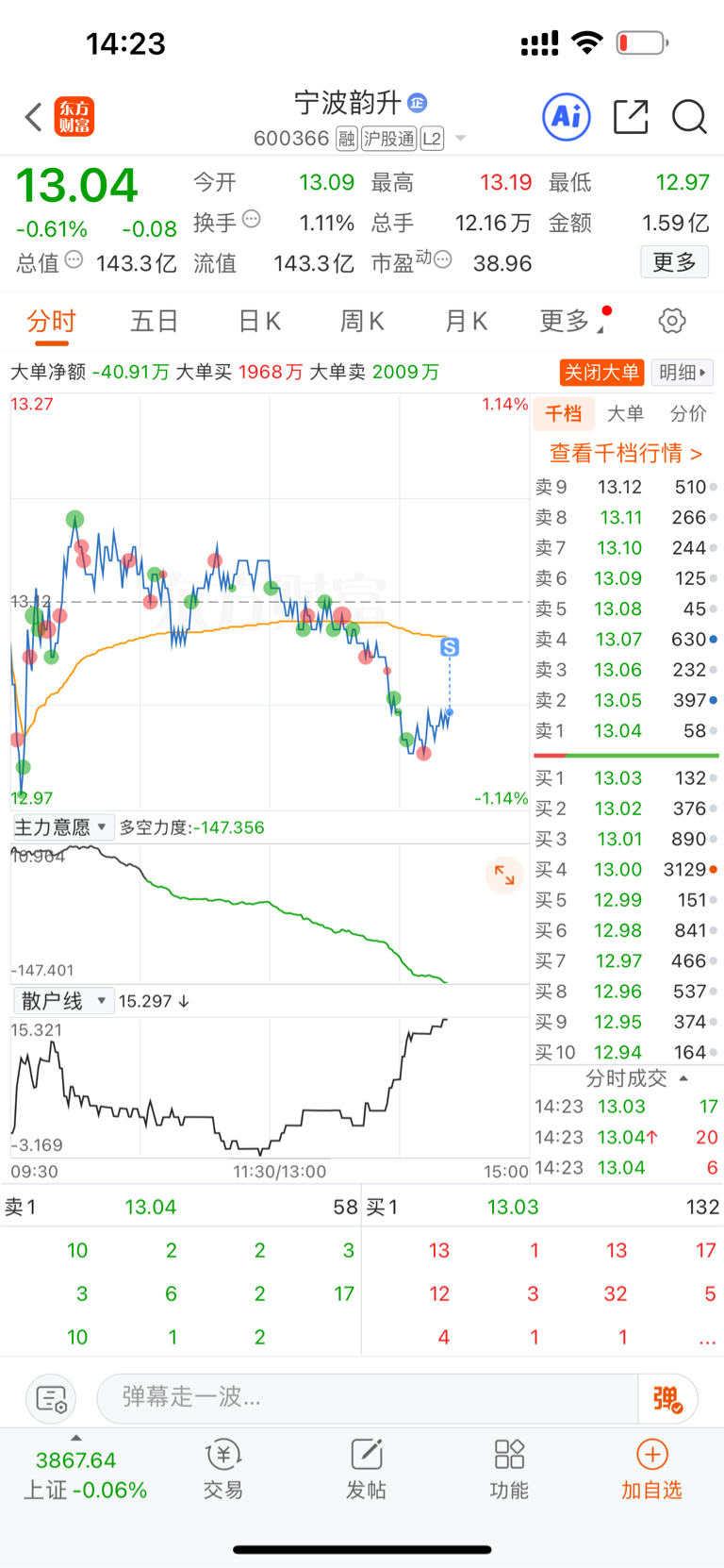 $宁波韵升(SH600366)$ 开始成交了,割完一身轻