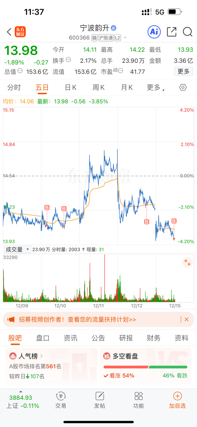 $宁波韵升(SH600366)$ 13快割肉的,这几天又追高进来了
