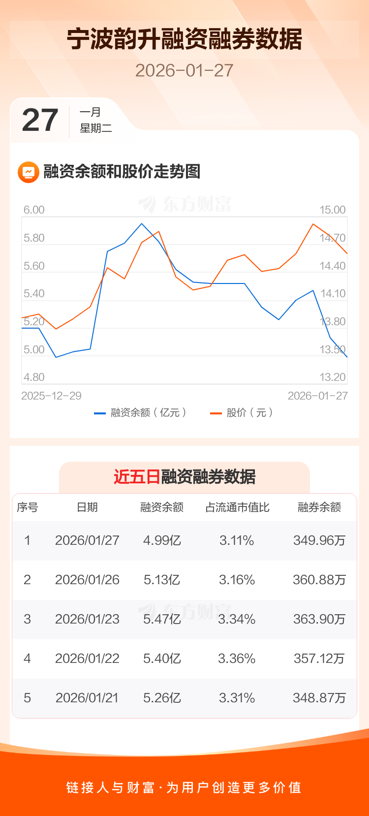 交易所最新数据显示,宁波韵升于2026年1月27日获融资买入4646.32万元,融资偿还6072.80万元,当日融资净偿还1426.48万元。目前,该股融资余额4.99亿,占流通市值比例为3.11%。