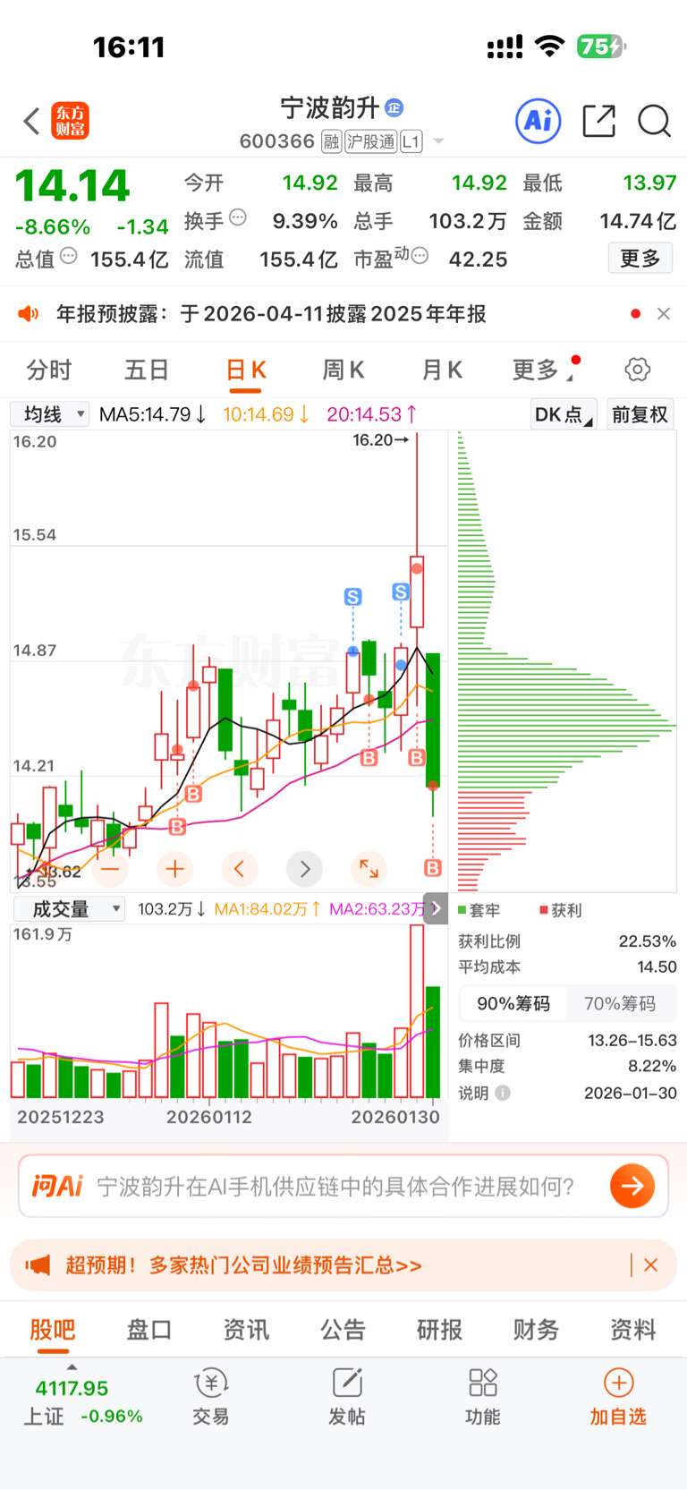 $宁波韵升(SH600366)$ 令人作呕的一只股,昨天都要回本了差几百今天来这一出