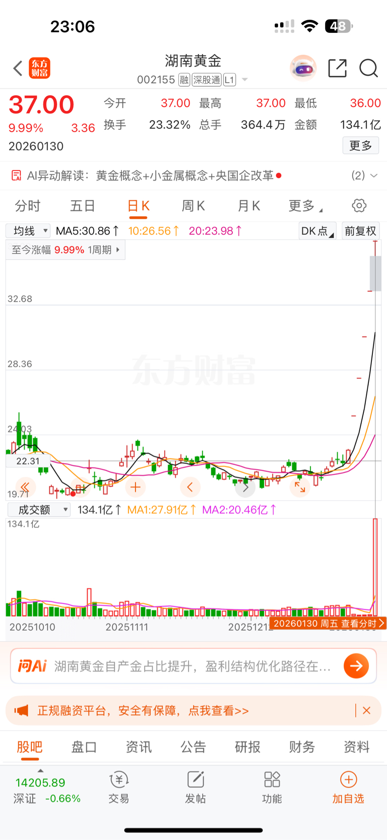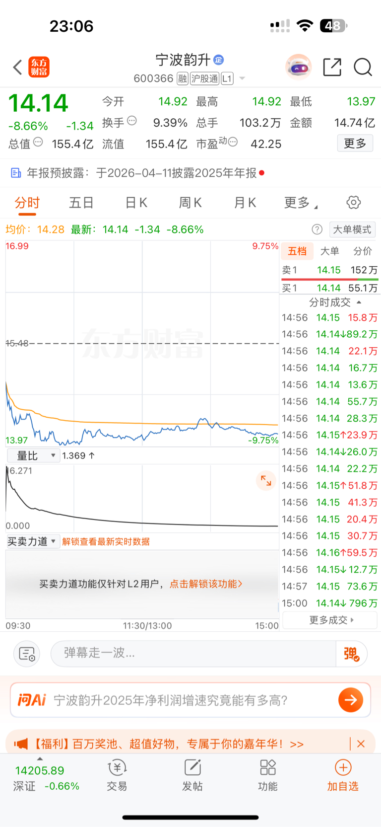 总有人把宁波韵升和黄金比,还说周一继续下杀,是因为黄金,周一是不是下杀我不知道,