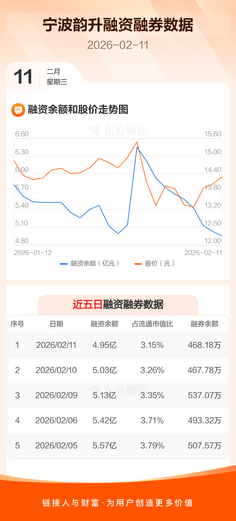 交易所最新数据显示,宁波韵升于2026年2月11日获融资买入4580.54万元,融资偿还5383.11万元,当日融资净偿还802.57万元。目前,该股融资余额4.95亿,占流通市值比例为3.15%。