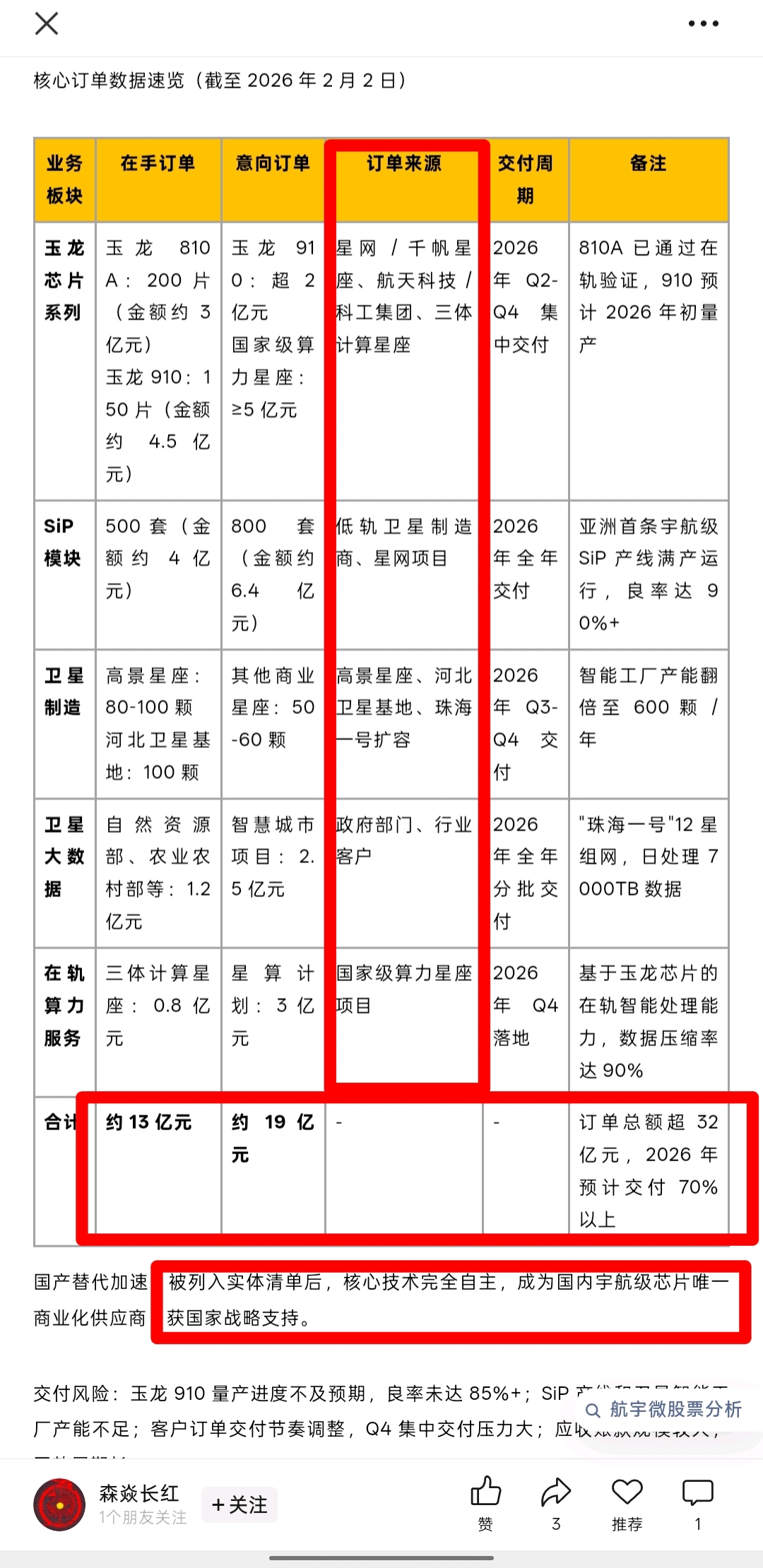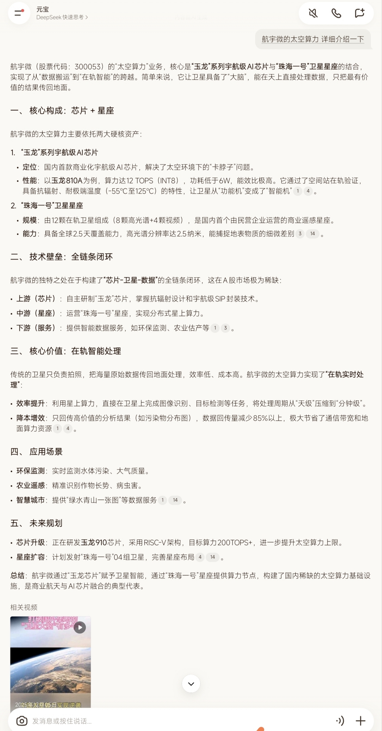 玉龙芯片已锁定太空数据中心等重大项目订单,2026年有望贡献显著营收[10]。严重低估航宇微300053AI芯片(国内唯一太空在轨验证并量产)技术全面适配高超音速/战术/防空导弹,制导已批量供货三体计算星座(太空计算)、低空无人机(飞行器)导弹、航天科技、航天科工、登月、空间站、深空、火箭、太空挖矿机器人、中电科,已签和未来订单达数十亿(每颗星或飞行器无人机导弹必备制导AI芯片)。中国星链唯一太空算力英伟达-航宇微300053低轨卫星链战争的秘密武器。航宇微是低空和亚轨道飞行器(导弹同源)独家芯片供应商,为航天科工导弹体系提供间接配套;直接利好:航宇微玉龙芯片具有:26年600颗卫星建造产能+AI算力芯片精确导弹(或航天飞行器)制导+中国星链AI大脑(未来20万颗卫星标配,单颗200万,未来应收百亿以上)+反舰高光谱卫星遥感侦查军民2用(A股唯一1家)+卫星大数据AI业务闭环(全球唯一)-这就是最正宗的受益方向标的。