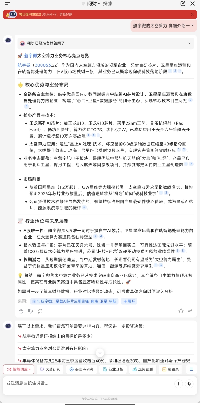 航宇微300053太空算力在手订单13亿意向订单16亿,中科院计算所采用“一星多卡”架构的算力核心-部署2026年下一代卫星组网计算星座,该架构通过单星搭载多枚航宇微300053玉龙810宇航AI芯片实现算力集群化,峰值算力达576 TOPS,玉龙810芯片展现出卓越的太空适应性——在-40℃至85℃极端温度环境下仍能稳定运行,辐射加固等级达SEL免疫,单芯片峰值算力720TOPS,能效比突破5TOPS/W,远超美国SpaceCube v3.0系统采用的传统DSP方案。单颗遥感卫星的应用服务收入可提升3-5倍,因为实时处理能力使其能提供高附加值的智能分析产品,而非简单的原始数据。订单来源:国家星网,千帆星座,航天科技,航天科工,国家河北卫星基地,国家算力基建-航宇微300053太空旅游飞行器建造商-芯片EDA存储芯片卫星芯片央国资-低位低价- 填补国内高性能抗辐照AI芯片空白,满足太空环境需求,打破国外垄断[3][4]。