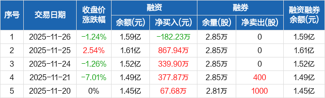 融资方面,当日融资买入300.39万元,融资偿还482.62万元,融资净偿还182.23万元。融券方面,融券卖出300股,融券偿还300股,融券余量2.85万股,融券余额11.34万元。融资融券余额合计1.59亿元。