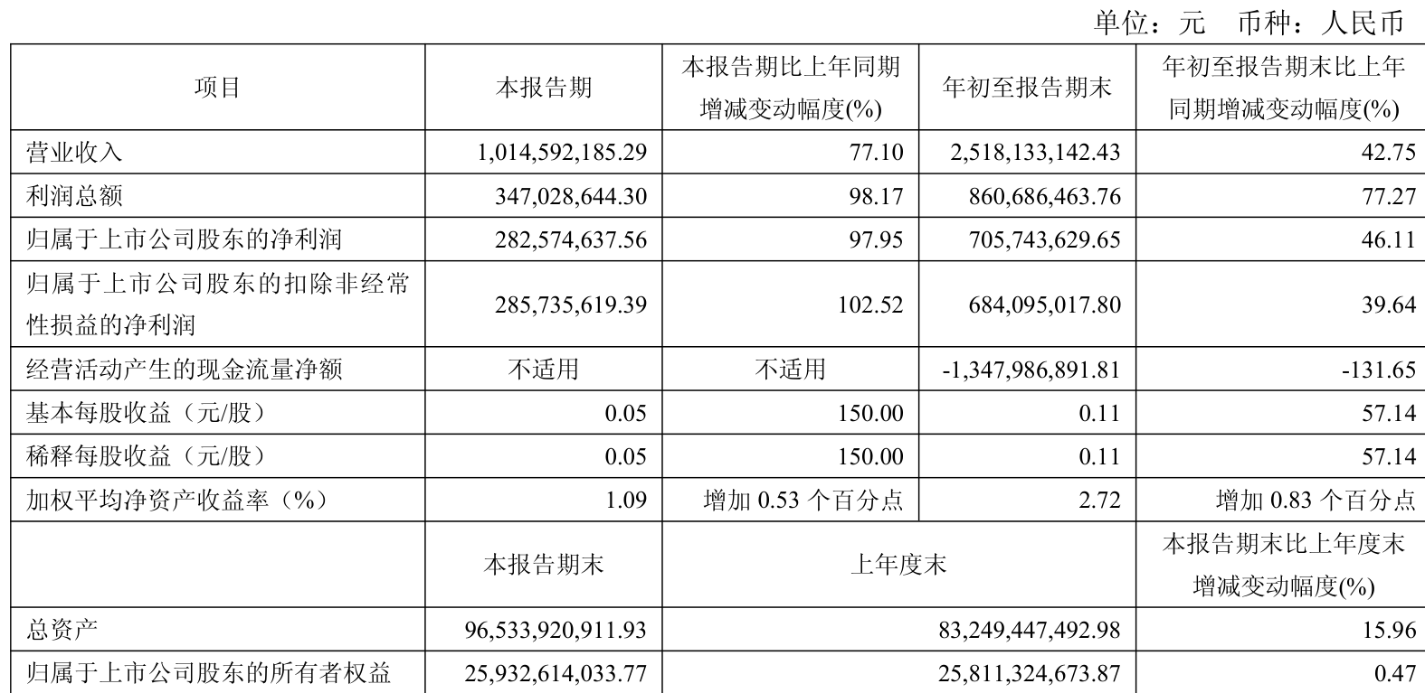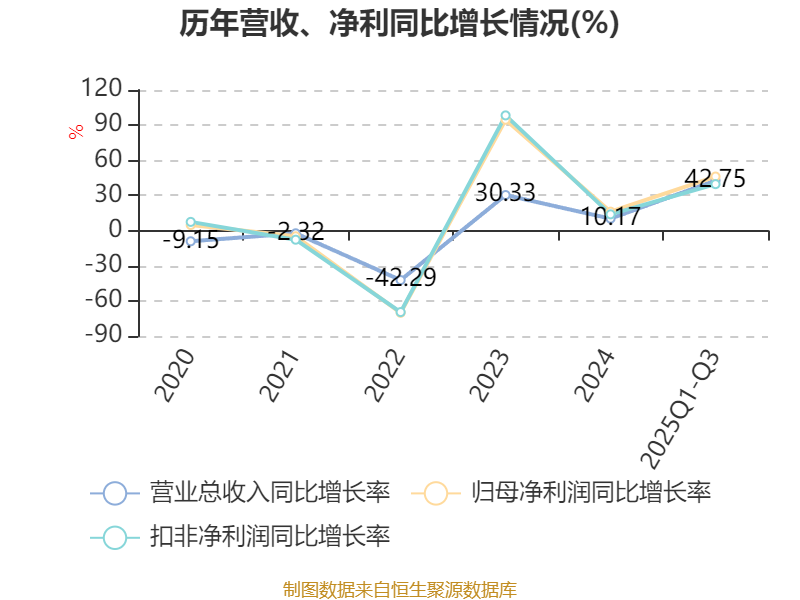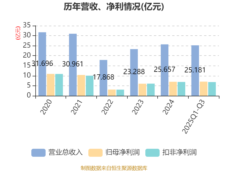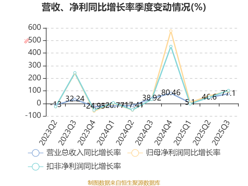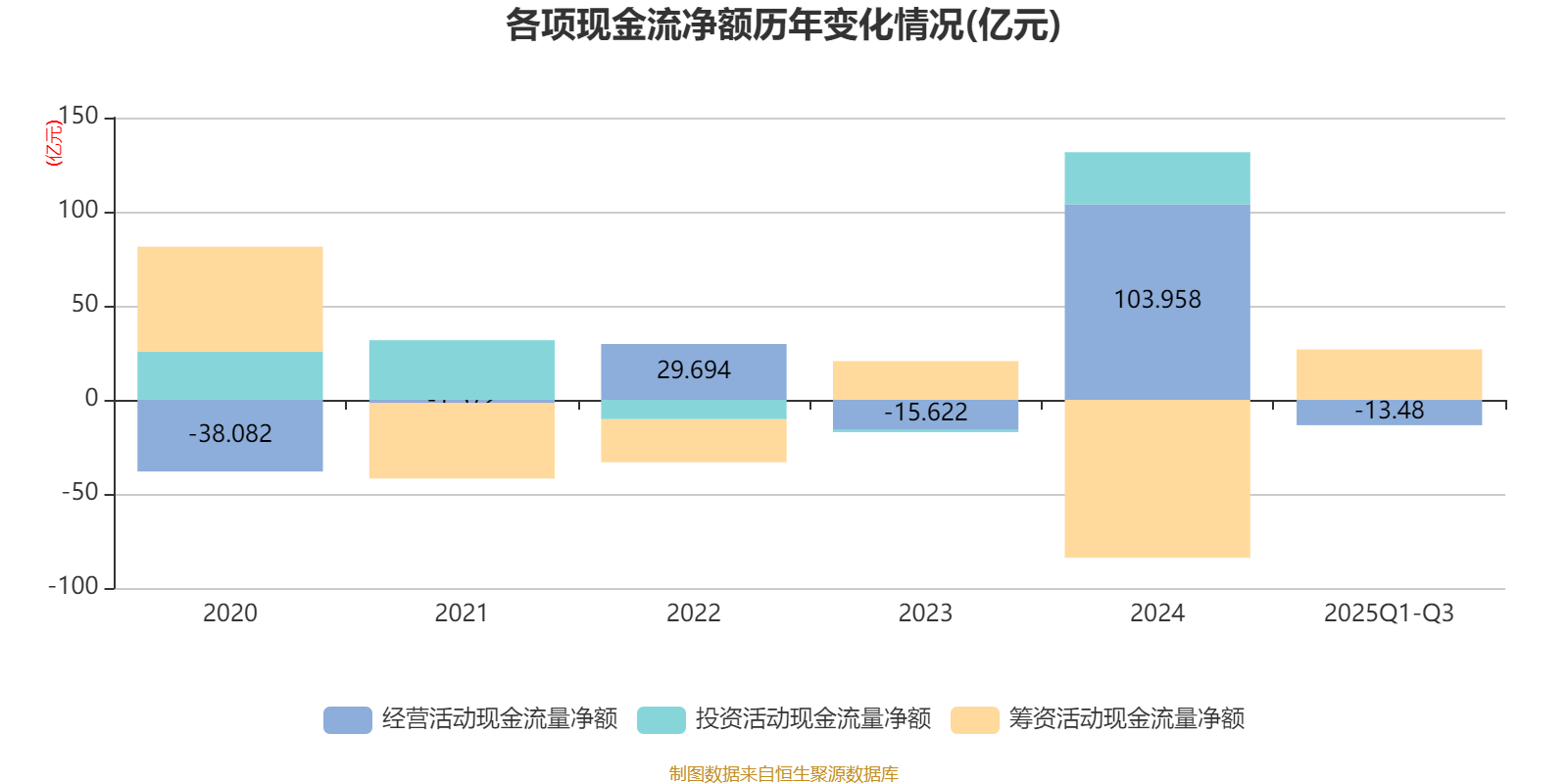 2025年前三季度,公司经营活动现金流净额为-13.48亿元,同比减少56.08亿元;筹资活动现金流净额26.72亿元,同比增加95.26亿元;投资活动现金流净额588.85万元,上年同期为19.92亿元。