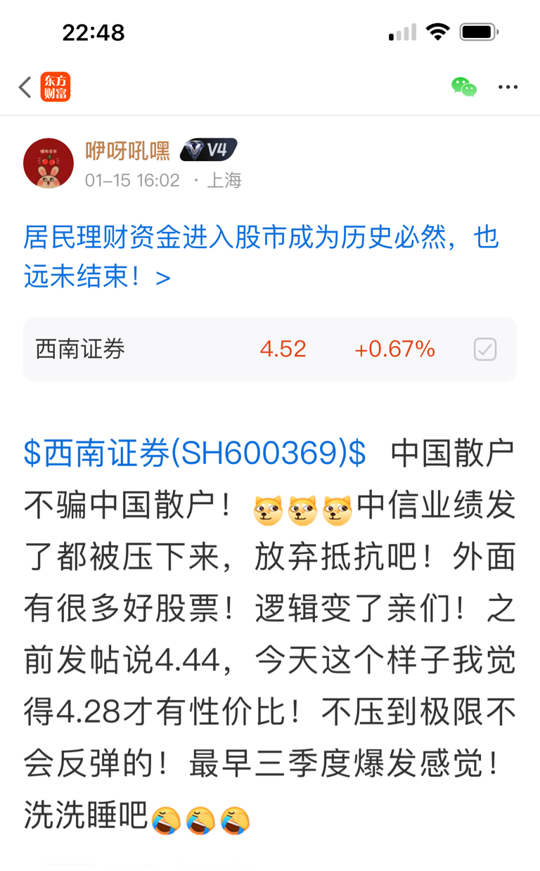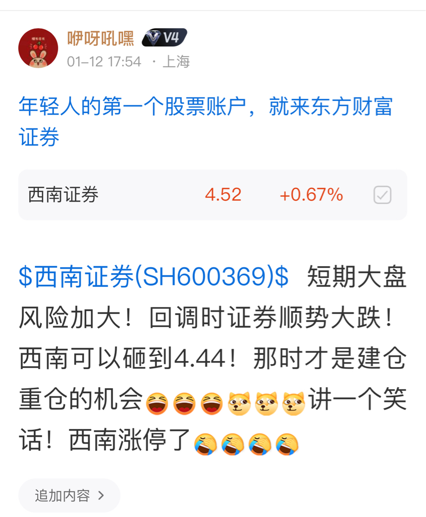 温馨提示: 1.根据《证券法》规定,禁止编造、传播虚假信息或者误导性信息,扰乱证券市场;2.用户在本社区发表的所有资料、言论等仅代表个人观点,与本网站立场无关,不对您构成任何投资建议。用户应基于自己的独立判断,自行决定证券投资并承担相应风险。《东方财富社区管理规定》