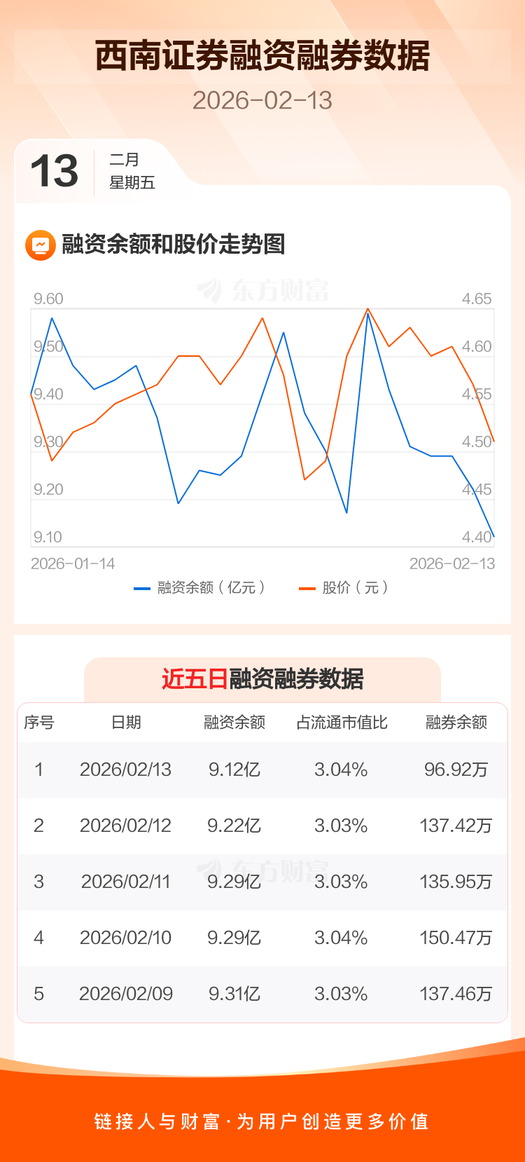交易所最新数据显示,西南证券于2026年2月13日获融资买入1295.37万元,融资偿还2247.06万元,当日融资净偿还951.69万元。目前,该股融资余额9.12亿,占流通市值比例为3.04%。