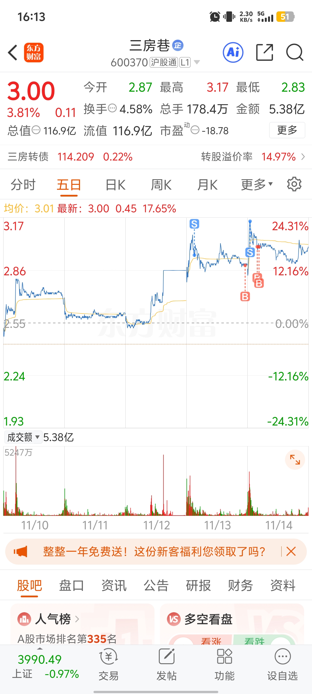 $三房巷(SH600370)$ 持股一周了 今日又小T了下,成本大概2.4 ,今日主力出货比较多,下周继续观望吧!心态最重要!