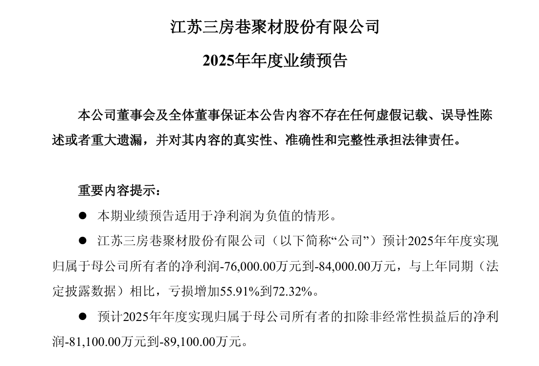 1月19日晚间,三房巷(600370)公告称,公司预计2025年年度实现归属于母公司所有者的净利润-8.4亿元至-7.6亿元,亏损同比增加55.91%到72.32%;预计实现归属于母公司所有者的扣除非经常性损益后的净利润-8.91亿元至-8.11亿元。