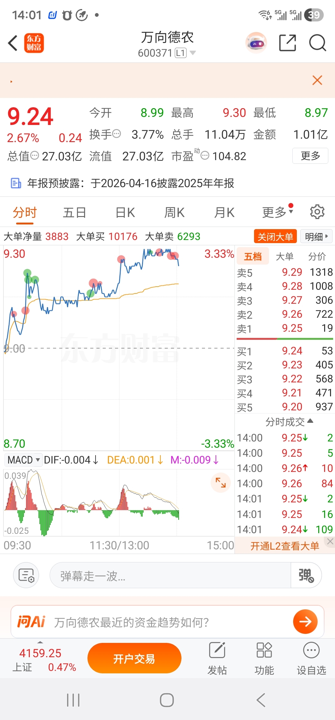 $万向德农(SH600371)$ 主力压住,不让涨太多