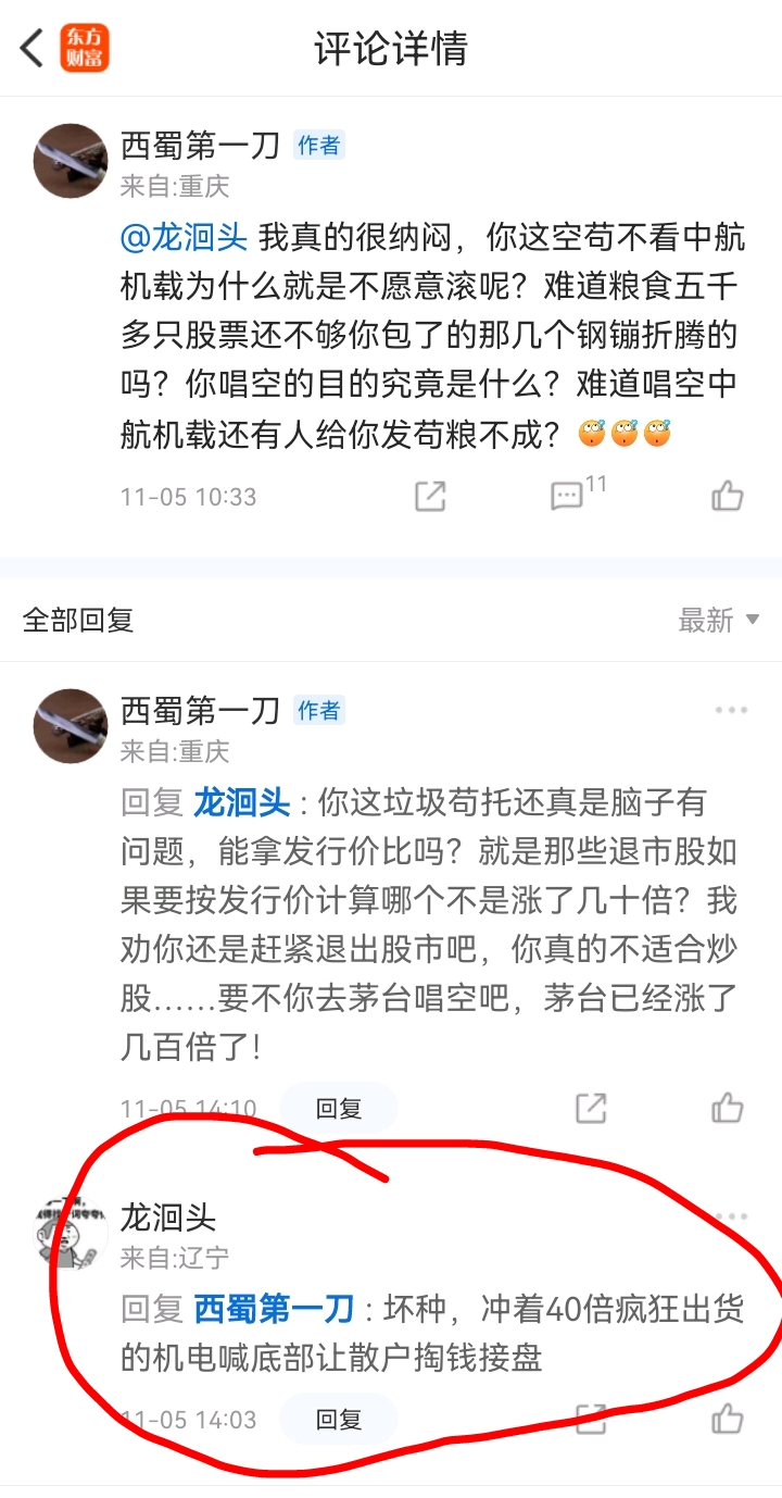 奉劝@龙洄头 你这苟托千万别太嚣张了!俗话说的好,天狂必有雨,人狂必有祸。前几天你这狗托一直唱空中航机载忽悠股民在12元割肉的帖子已经截图,反正我是记住你了,只是现在中航机载只涨了两个点,股民的损失不大,所以不想和你计较。等中航机载大涨之后,就让割肉的股民起诉你这个苟托赔偿它们的损失,希望你好自为之!