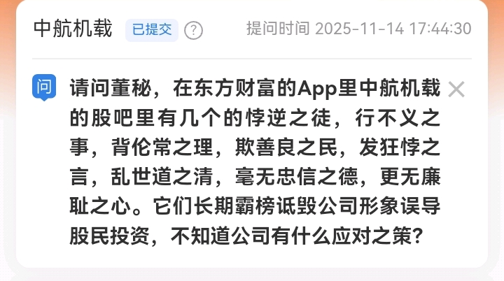 董秘,希望你不要让真正持有中航机载的股民失望!