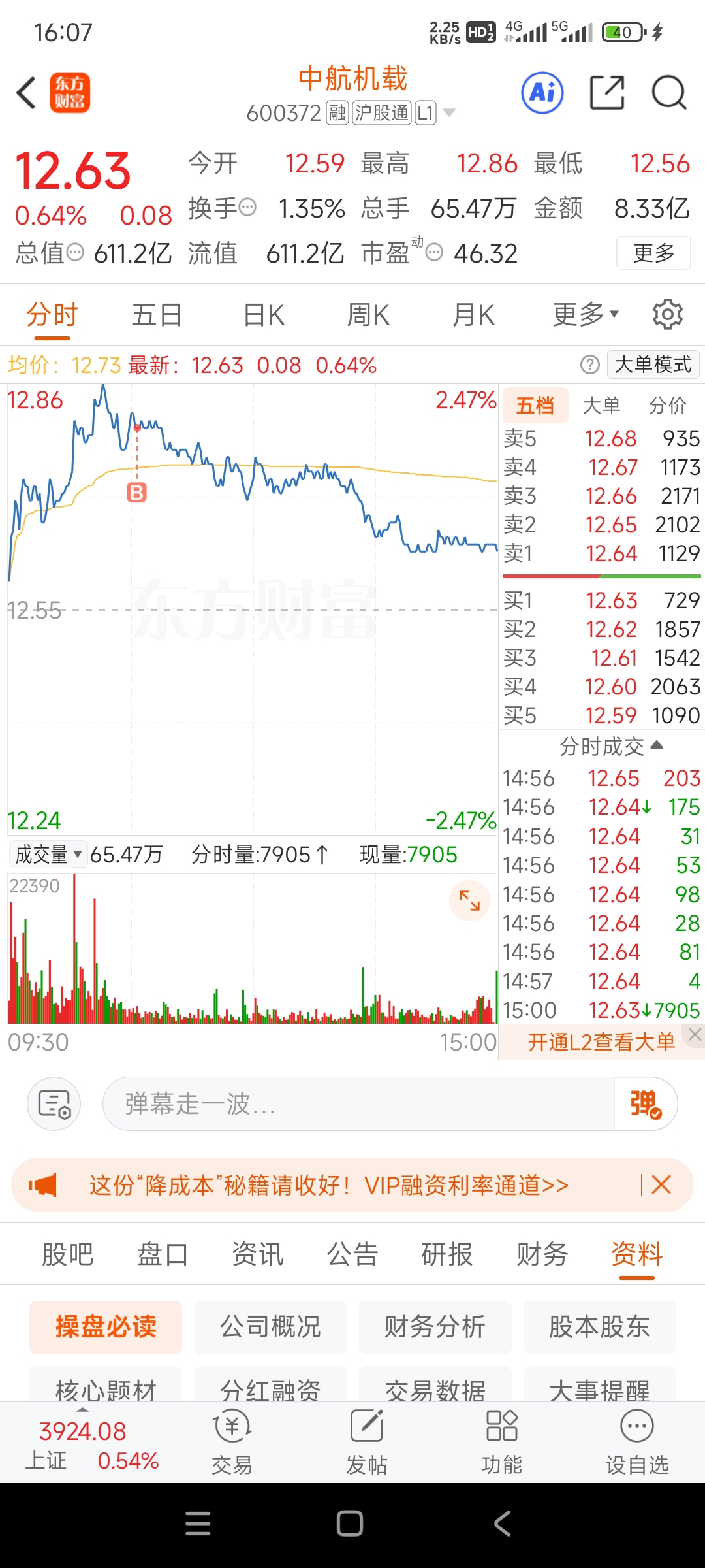 $中航机载(SH600372)$ 早上12.80追高了,各个指标都是多头,指望他突破往上走一波,没想到直接兑现,看这一波回落多少,跌破均线就手动止损。