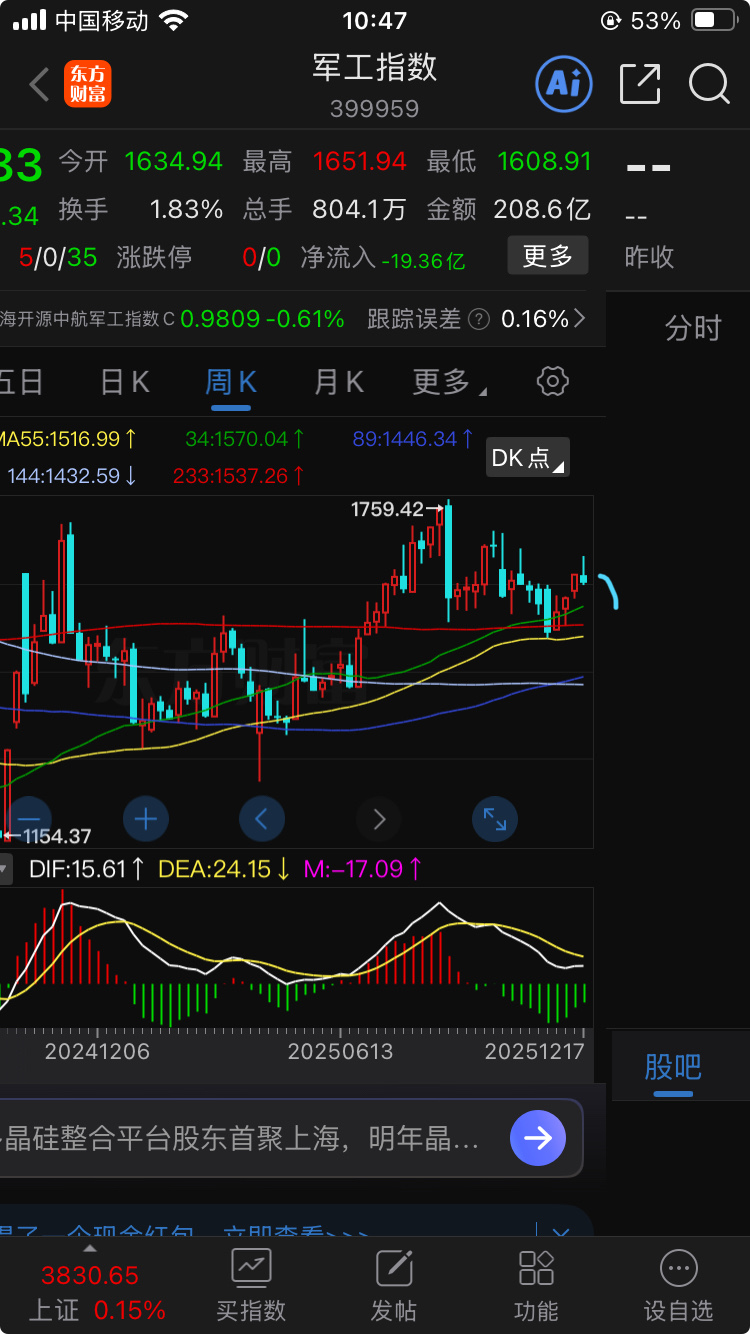 军工指数板块从周线级别均线态势判断——至少有两周左右的回踩绿色均线动作,作为从红色均线开始上涨以来的这个第二波上行的2浪下跌段