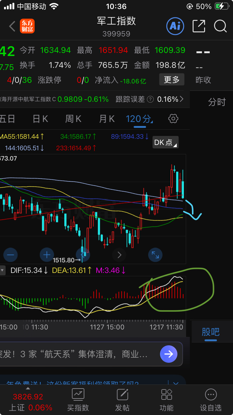 军工120分钟级别这波跌破红色均线,跌势迅猛——预计回踩下方黄、绿均线所在区域,