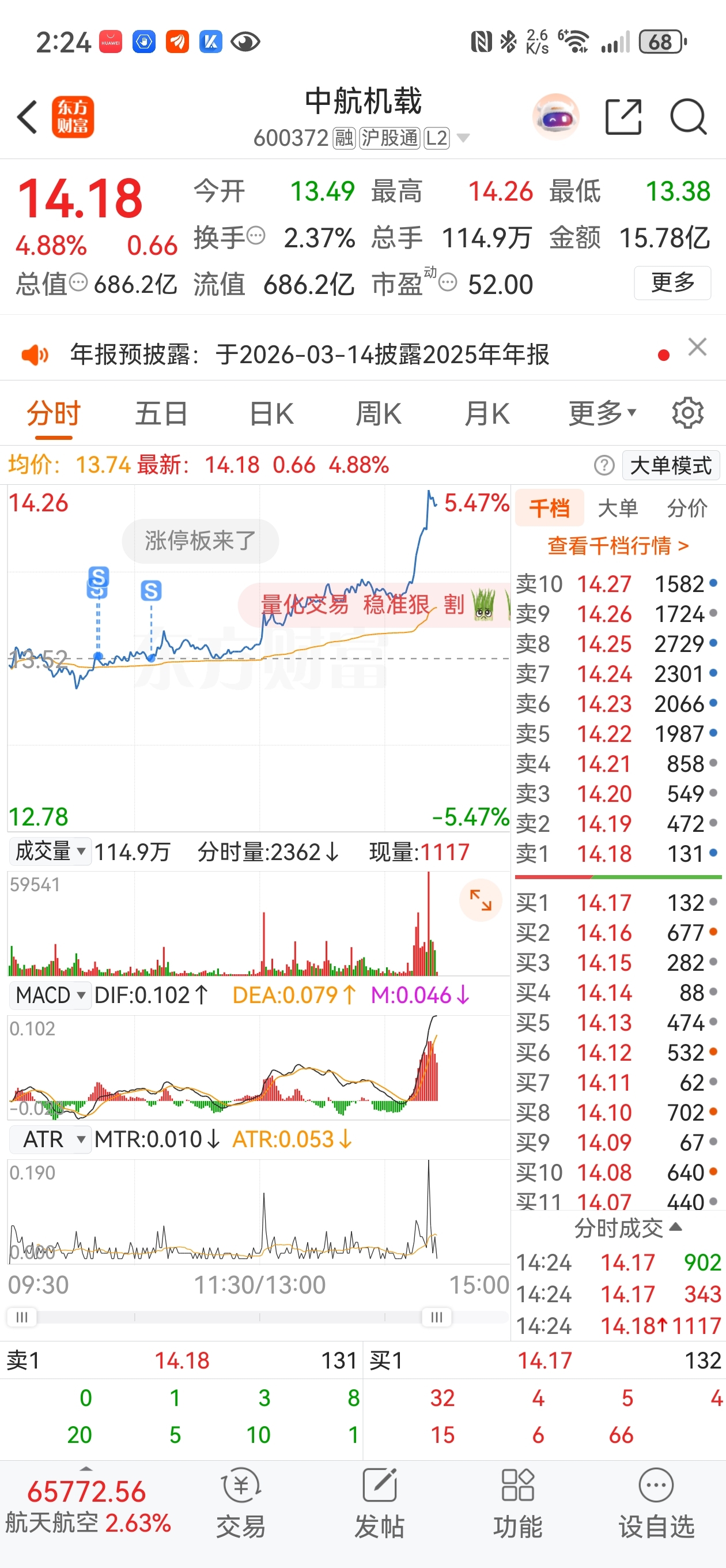 $中航机载(SH600372)$ 谢谢您嘞,赚了100走了,目前少赚10000