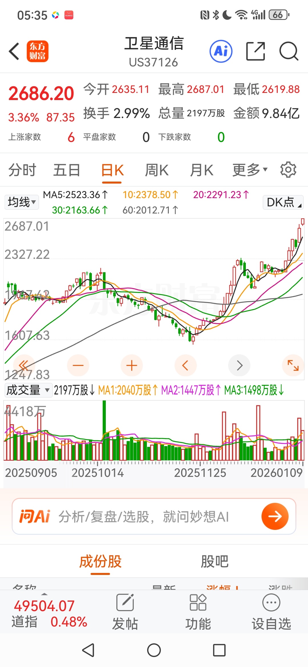 再看看人家的卫星通信,在现下3万亿日成交且每日新增资金源源不断流入的大牛市背景之下,请问还在如此低位且刚刚起动的票还能剩几只?
