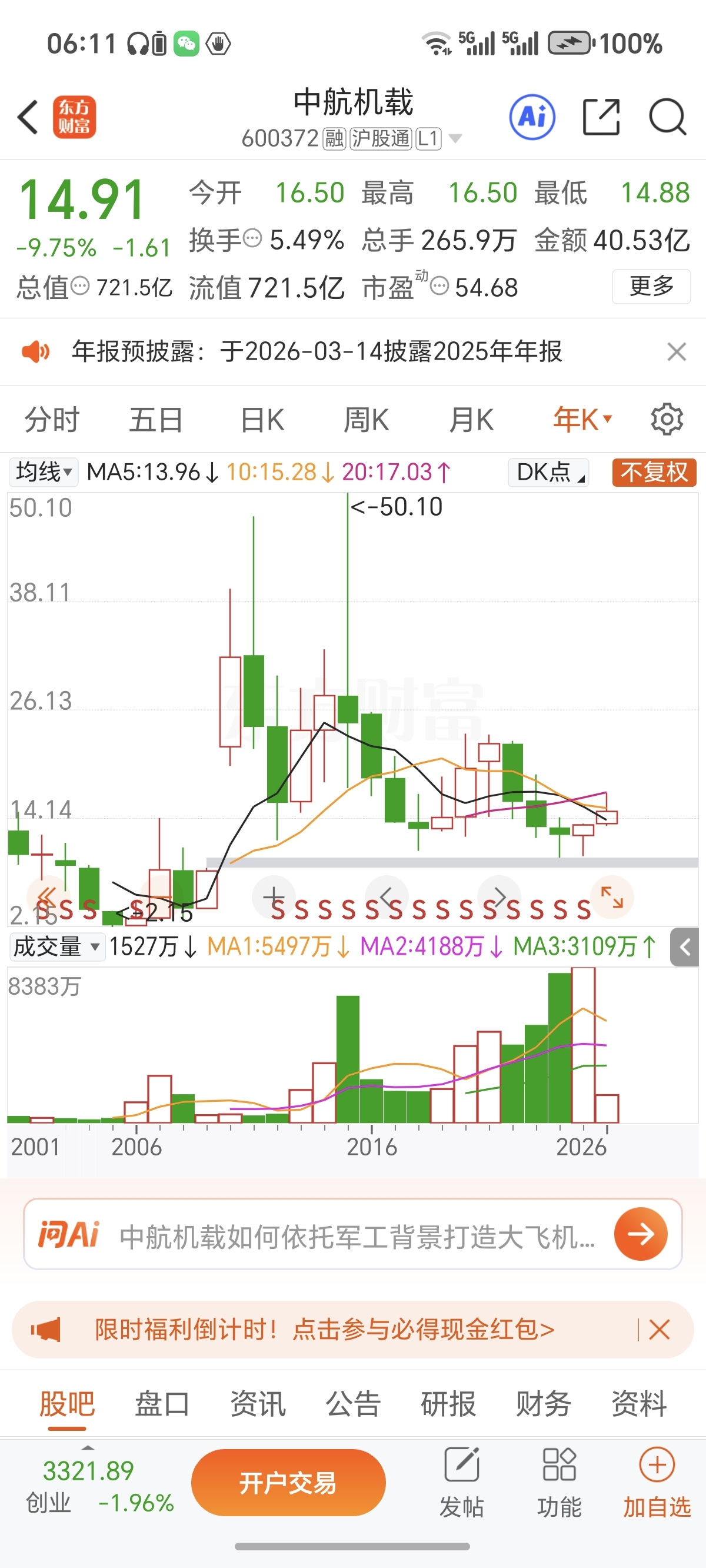 看看机载的年线,股价还在2005年,经过20年发展,合并了中航机电,我就不信,他