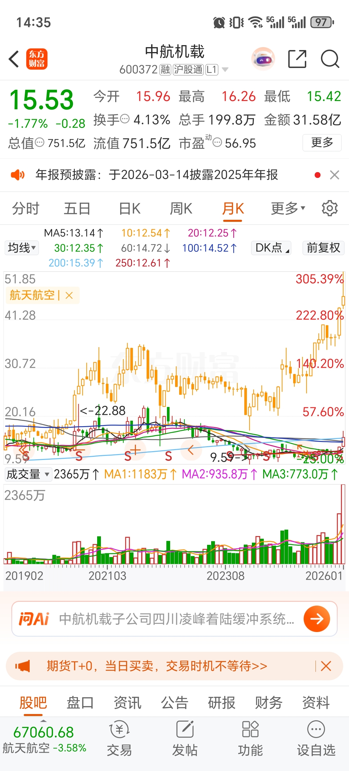 $中航机载(SH600372)$ 2019年2月至今,中航机载严重落后板块305%,应该补涨至45至51元