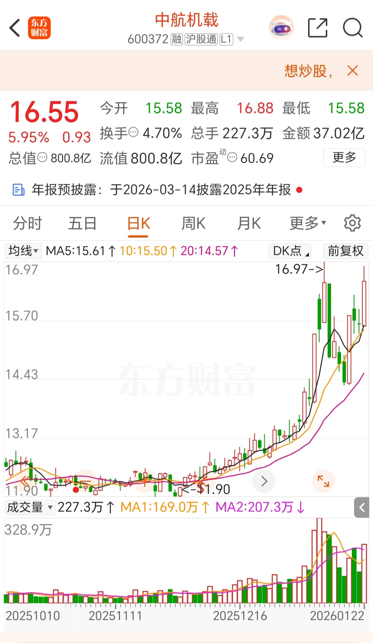 中航机载的收盘价16.55元,是近32个月以来的最高收盘价,也算是一个小小的突破吧!今天值得表扬,明天再接再厉。